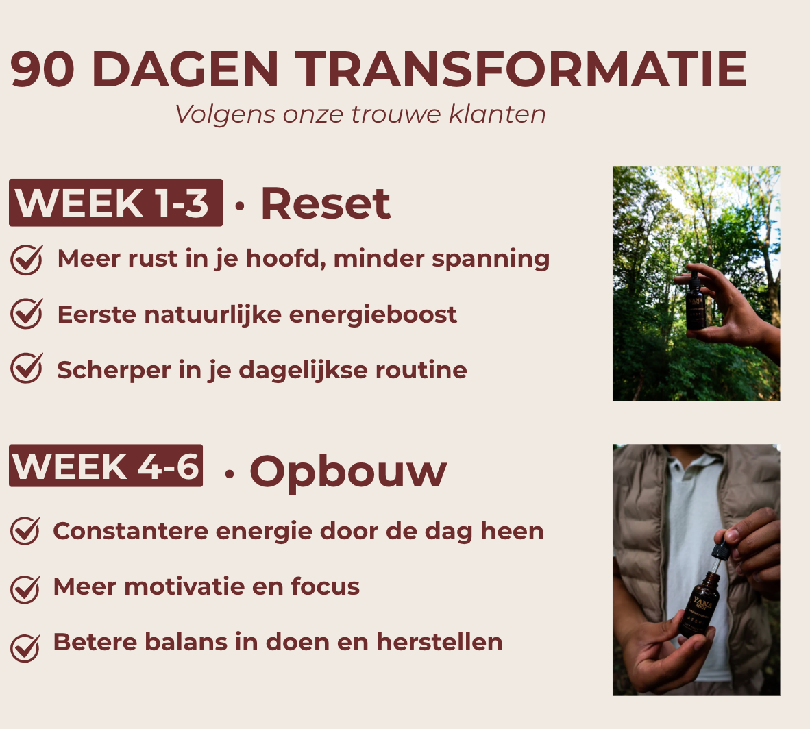 Wij geloven dat je de kracht van YANA MEN moet ervaren zonder risico. Merk je binnen 30 dagen geen verschil? Dan krijg je je aankoopbedrag gewoon terug – zonder lastige vragen.