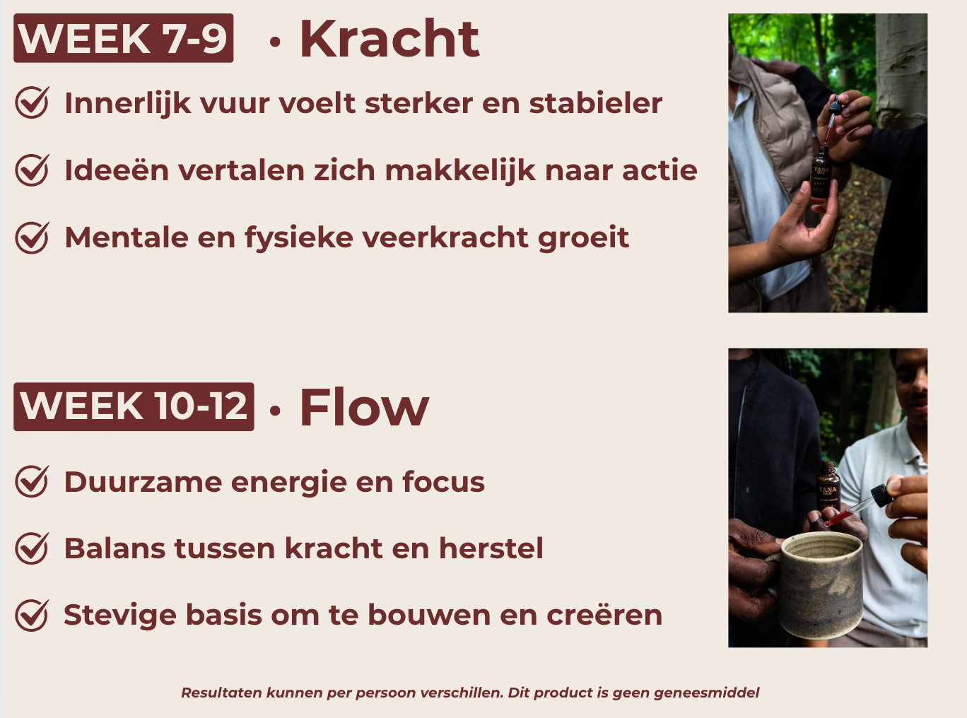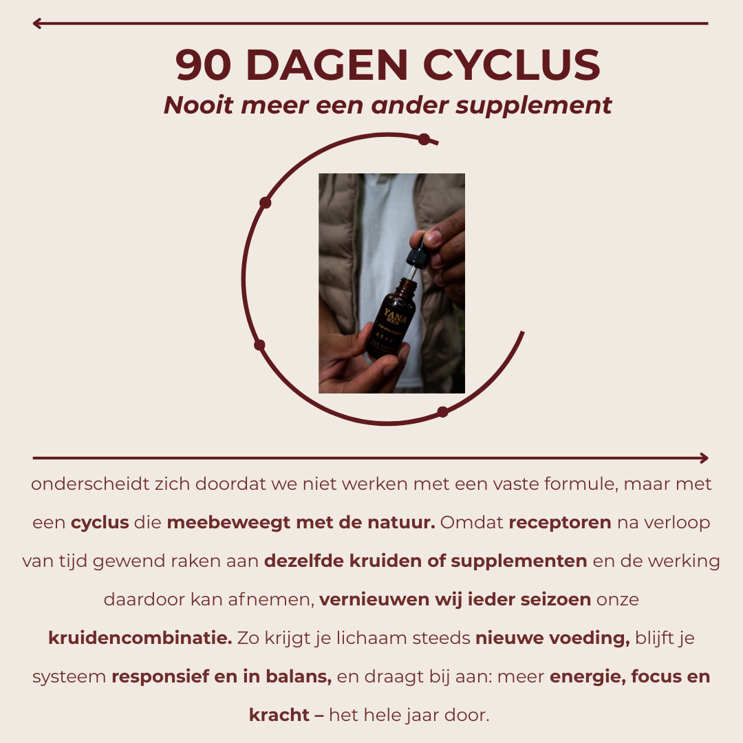 Na 90 dagen stap je automatisch over op een nieuwe kruidencombinatie. Hierdoor blijft je lichaam verrast, voorkom je gewenning en blijft het effect maximaal. De cyclus herstart, zodat je energie, focus en vitaliteit continu op peil blijven – zonder dat je ooit moet wisselen naar een ander supplement.